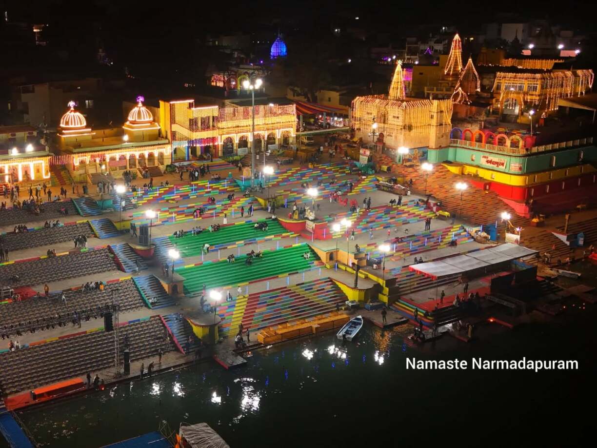 नर्मदा के पुण्यतट पर असंख्य तीर्थस्थल स्थित हैं। पद्मपुराण में अमरकंटक पर्वत के चारों ओर साठ करोड़ साठ हजार तीर्थाें की स्थिति बताई गई है। इनमें से पत्रेश्वर, अंगारेश्वर, कुण्डलेश्वर, विमलेश्वर, पिपलेश्वर, पुष्करिणी, शूलभद्र, भीमेश्वर, नर्मदेश्वर, आदित्येश्वर, मल्लिकेश्वर, वरूणेश्वर, नीराजेश्वर, कोटितीर्थ, शक्रतीर्थ, सोमतीर्थ आदि प्रमुख हैं। इन तीर्थों के दर्शन से अक्षय-पुण्य की प्राप्ति होती है। मध्यप्रदेश में इन्दौर के निकट नर्मदा के तट पर ओंकारेश्वर का प्रसिद्ध तीर्थ है, जो शिव के बारह प्रसिद्ध ज्योतिर्लिंगों में एक है। इनके दर्शन के लिए नर्मदा की प्रदक्षिणा का पौराणिक विधान है, जो सांस्कृतिक दृष्टि से विशेष महत्त्व का है। नर्मदा प्रदक्षिणा का मार्ग 1780 मील लंबा है। यह प्रदक्षिणा अमरकंटक अथवा हंडिया से प्रारंभ होती है। इसे पूर्ण करने में 108 दिन से लेकर तीन वर्ष, तीन मास व तेरह दिन तक का समय लगता है।